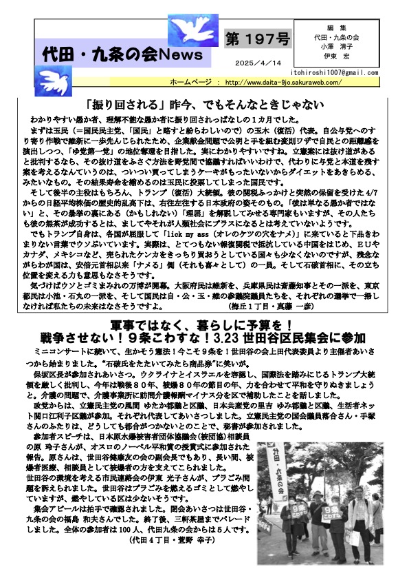 「代田・九条の会」は、2008年11月3日に発足しました。「代田・九条の会」